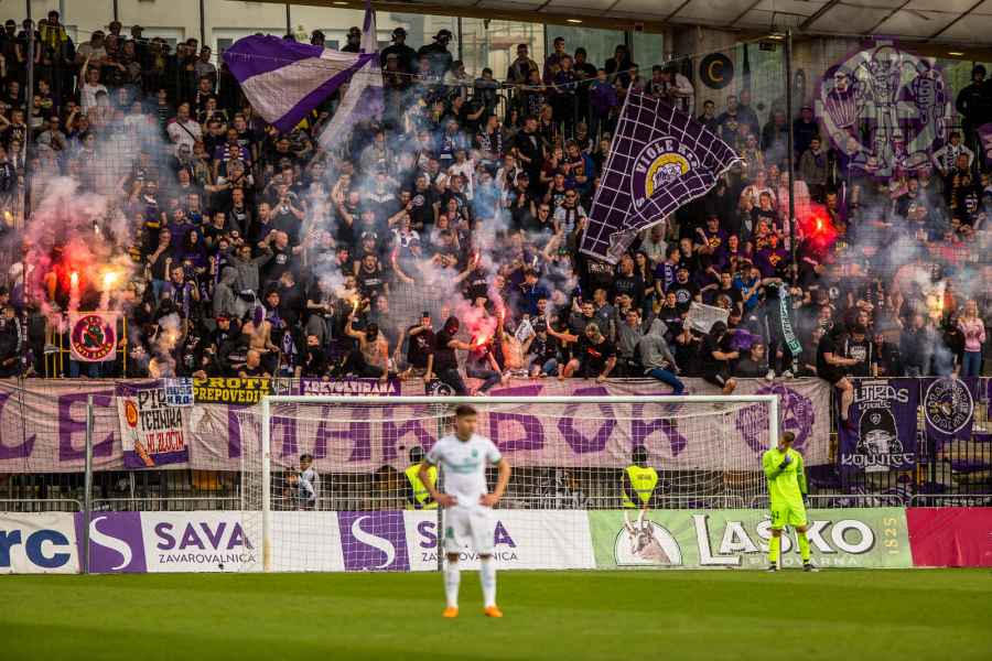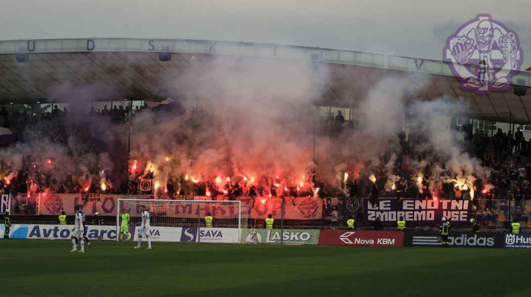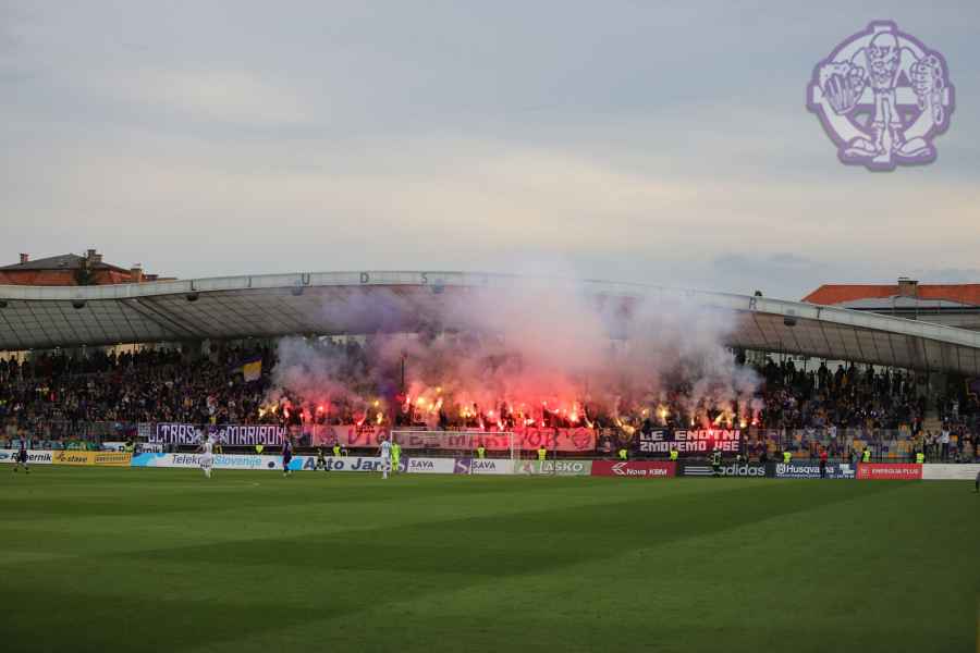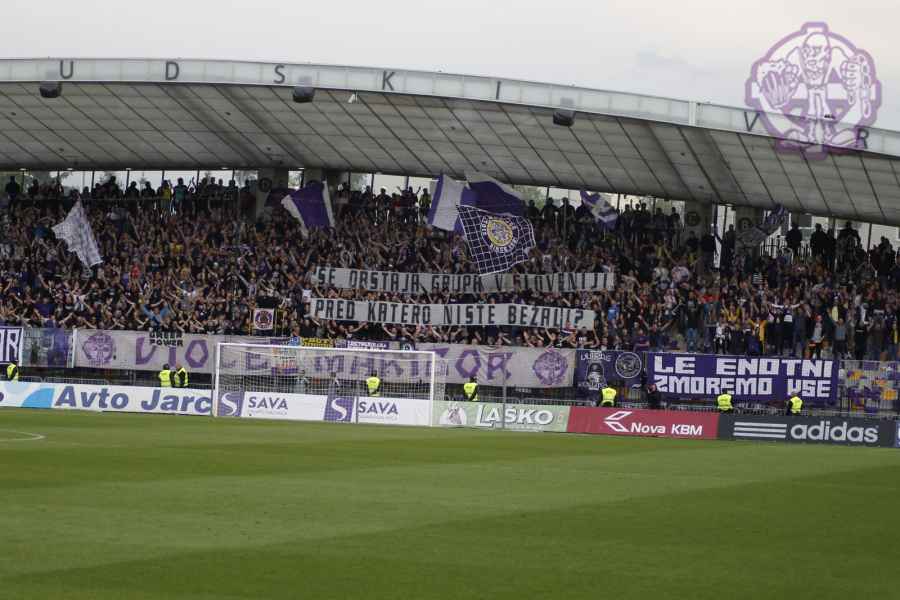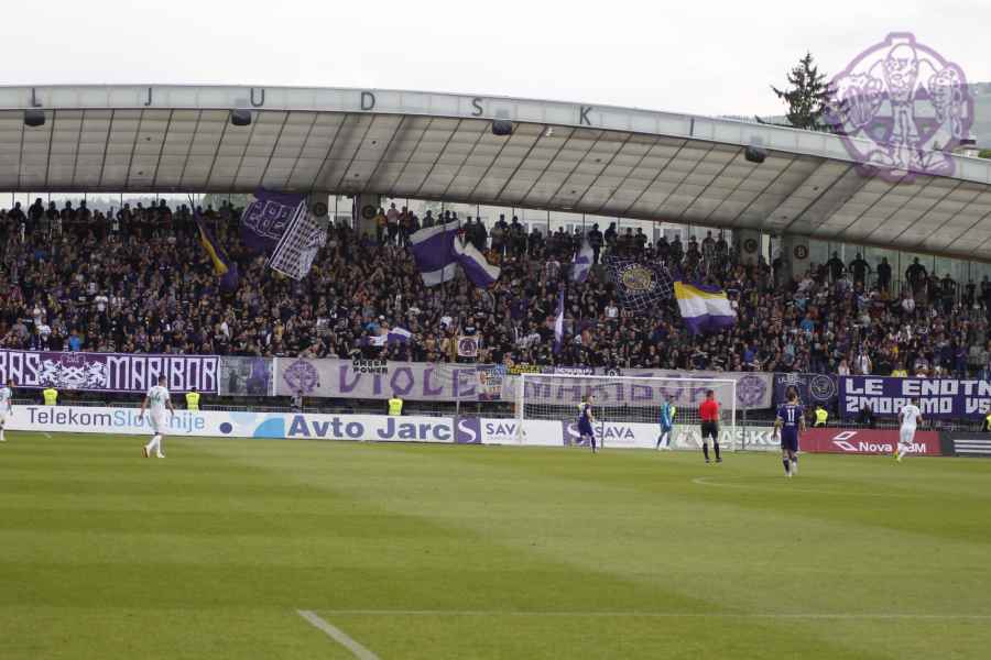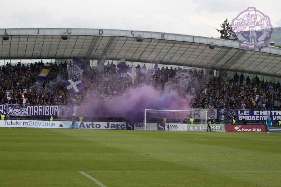 Dobro oddelan derbi iz naše strani, je na žalost pokvarila predstava naših pubecov na terenu, ki bi si lahko z zmago zagotovili že 15. naslov državnih prvakov in tako vse skupaj prestavili še za krog ali dva. Solidno število Viol na zboru, je napovedovalo dober korteo proti stadionu, kar se je tudi uresničilo. Transparent ULTRAS MARIBOR v prvi vrsti, glasna pesem in ogromno prižgane pirotehnike, je dodatno ogrelo še ostale navijače Maribora na južni ploščadi, ko so Viole prišle do stadiona. Glasno navijanje od 1. minute igre ni pojenjalo niti pri vseh treh žabarskih zadetkih. Okoli 15. minute se dvigne koreografija (za katero ponovno gredo pohvale vsem, ki so pomagali pri njenem nastajanju) posvečena 100. letnici nogometa v Mariboru in 1 SSK Maribor, predhodniku NK Branik. Pred jugom je bil dvignjen grb kluba, na tribuni pa izpisana letnica 1919, ki se zaradi nekoliko slabše razporeditve ljudi na jugu ni izpisala najboljše. Udarno mesto na ograji je tokrat spet imel stari beli transparent VIOLE MARIBOR, okoli njega pa ostali večji in manjši. Izobešena je bila tudi fotografija žabarov iz lanskega derbija z prižgano vijol'čno dimno. V prvem polčasu protestno, zaradi dogajanja na terenu iz juga poleti tudi nekaj bakelj in prižge se nekaj vijol'čnih dimnih. V drugem polčasu se navijanje nadaljuje v istem ritmu kot v prvem. Tekom drugega polčasa je dvignjenih nekaj parol namenjenim gostom iz severa (ŠE OBSTAJA GRUPA V SLOVENIJI, PRED KATERO NISTE BEŽALI?, ZA TRIPADVISOR IN VIOLE, JE LJUBLJANA NA 1. MESTU ZA IZLETE IN SPREHODE, zraven pa 5 fotografij Viol v LJ iz zadnjih derbijev in ZELENI Z(M)AJČKI). V 60. minuti sledi konkretni pyroshow, med katerim večina bakelj konča na terenu. Pred koncem tekme sta dvignjeni še paroli DRŽI SE ZORAN in CHRIS KEEP RIGHT ON!. Zadnjih 10. minut tekme se poje pesem V ZMAGI AL PORAZU, pri pozdravu igralcev po koncu tekme se prižge že nekaj pirotehnike in tribuna jug s svojo energijo, pubecom na terenu "vlije" novih moči (za razliko od nekaterih na ostalih tribunah). Po kakšnih 10. minutah navijanja po tekmi, se igralci vrnejo iz slačilnice in še enkrat pozdravijo Viole, sledi glasno skandiranje ŠAMPIONI in nekaj pozdravov gostom iz Lj. Prvenstvo se nadaljuje v sredo 15.5. ob 20:15, ko gostujemo v Celju.